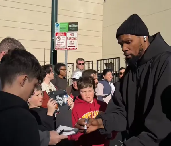 赛前,火箭社媒分享凯文-杜兰特为球馆外的球迷亲切签名的瞬间。
